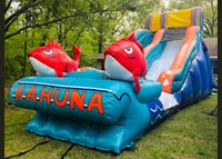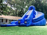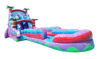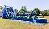 Our Tropical waterslides are our showstopper slides! If you are looking for "the BIG one" that is fun for all ages - this is it! This 22' tall Tropical Super Combo dual lane waterslide towers up 24' in the air making it our tallest slide yet! It comes in at a whopping 65' in length with a connected middle bumper all the way down! It has an inflated pool at the end; not a deep pool. (WET ONLY = comes with 2 blowers)21' wide x 65' long x 24' tall