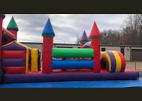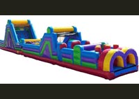 Talk about a showstopper! Battle one-on-one all the way to the end of our newest Obstacle Course! It's 70' of pure fun for everyone! Features a 40' Obstacle Course + a 30' Rock Climb Slide. (DRY ONLY + comes with 2 blowers)11' wide x 70' long x 11' tall